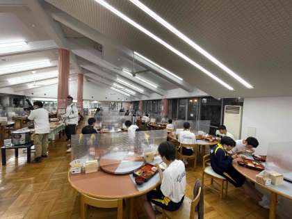 パーテーションに仕切られ、黙食です。