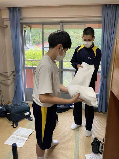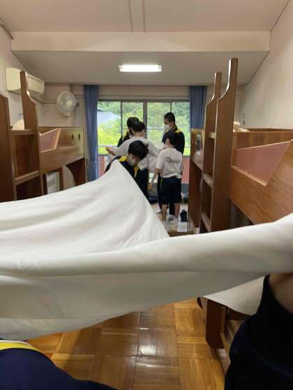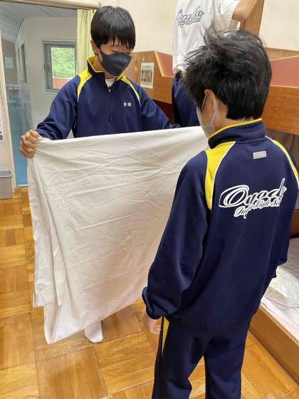 班員で協力して、シーツをたたみます。