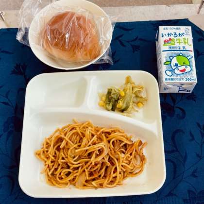 カレースパゲッティ、レタスとコーンのサラダ、固形チーズ、黒糖パン1/2、牛乳