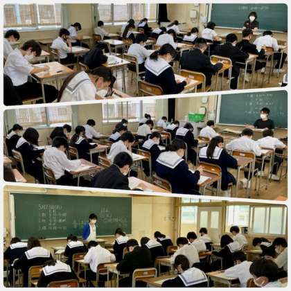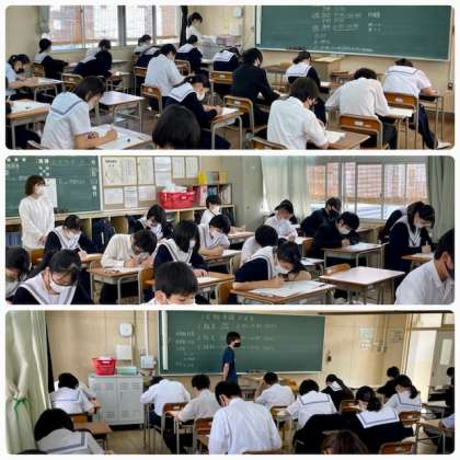 中間テスト第1日が始まりました。1年生は中学校に入学して、はじめての定期テストです。どの顔も真剣です。