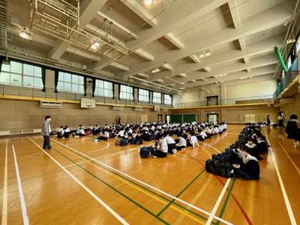 3年生は今日から3日間、信州方面に修学旅行に出発します。3年生の皆さんは集合時刻の午前8時までに体育館に集まってきました。