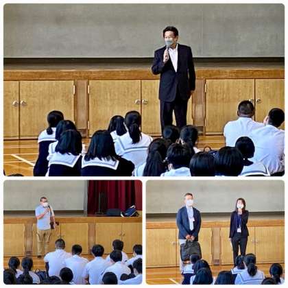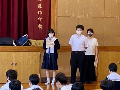 修学旅行実行委員会生徒代表のあいさつ、学年主任三浦先生のお話を聞きました。