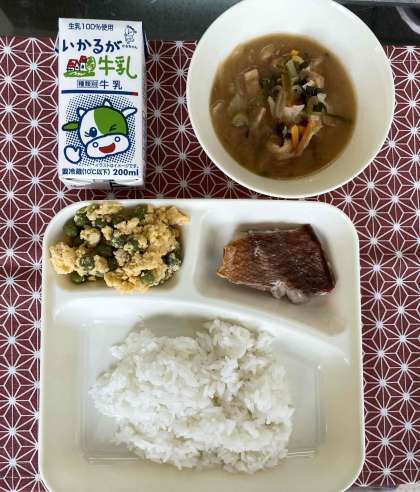 給食のメニューは、ご飯、あかうおのしょうゆだれ、みそ汁、えんどうの卵とじ、牛乳でした。