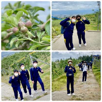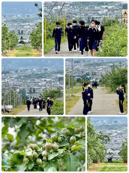 観光農園は傾斜地です。山々に囲まれた盆地の景色も楽しんみます。