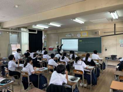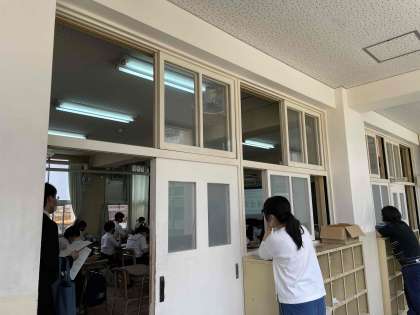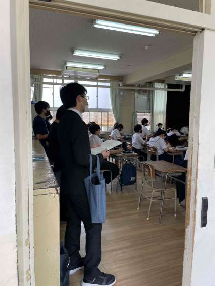 4限、2年3組にて教育実習生(卒業生)が研究授業をおこなっています。英語の授業で、たくさんの先生方が参観されています。