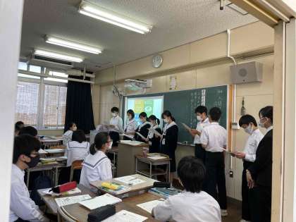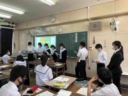 生徒たちによるグループ発表です。先生も心配そうにみつめ、助言されています。