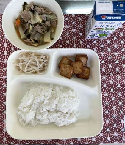 中華煮、あつあげのピリ辛じゅうゆ、もやしの中華あえ、ご飯、牛乳です。