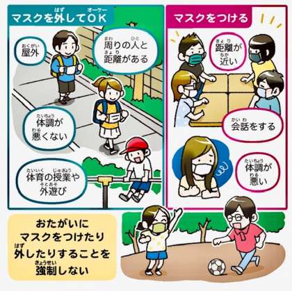 外せるか考えるポイントは、三つあるといいます。?外にいる?周りに人があまりいない?自分の体調が悪くない。「周りに人がいない登下校中や、屋外で遊ぶときは外していいけれど、せきが出たりのどが痛かったりと体調の悪いときや、人が集まるとき、会話があるときは引き続きつけてほしい」とありました。