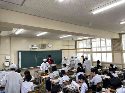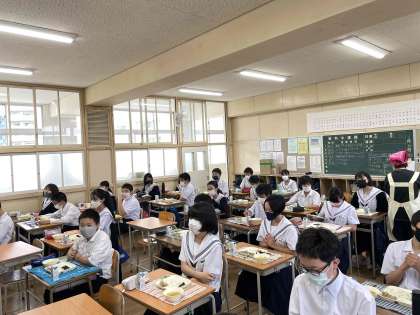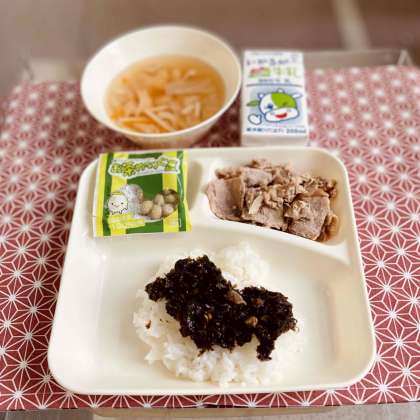 献立は、豚肉のごまみそ焼き、すまし汁、のりの佃煮、抹茶大豆、ご飯、牛乳です。