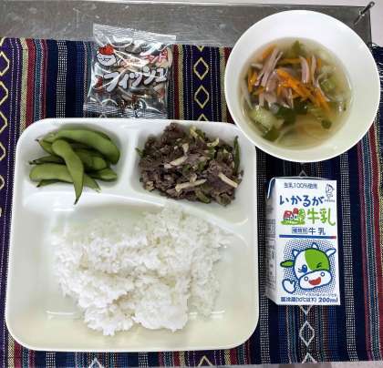 チンジャオニュウロウスー、ハムと野菜の中華スープ、えだまめ、アーモンドフィッシュ、ご飯、牛乳です。