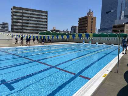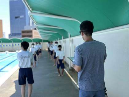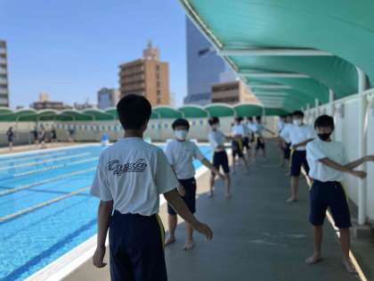 4限、3年1組の保健体育の時間に、研究授業をおこないました。今日はプールに入っています。