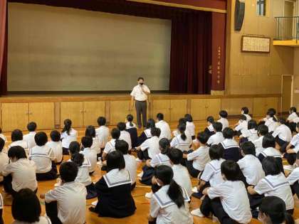 おはようございます。毎週月曜日は全校集会です。今日は雨天のため、体育館で実施です。