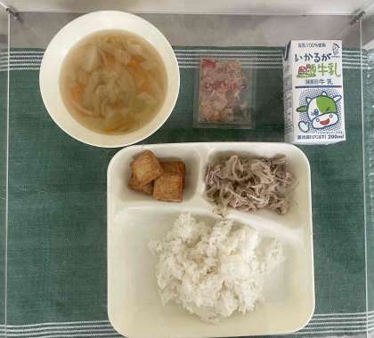豚肉ともやしの炒めのもの、すまし汁、厚あげのしょうゆがけ、ご飯、牛乳です。