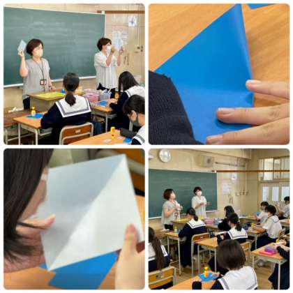 今回は、折り紙を使ってドラえもんを作りました。講師の先生の話ぶりもとても穏やかで、生徒のみなさんの心を掴んでいました。講師のお一人はなんと、校長先生が中学校時代に教えられた教え子さんでした。ご縁を感じました。