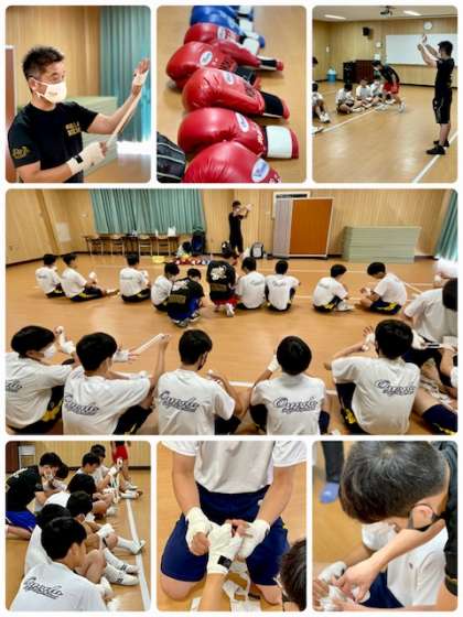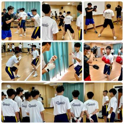 「ボクシング講座」です。部活動からの体験授業です。興国高校ボクシング部は史上初の同一校から複数の世界チャンピオンを輩出されている名門ボクシング部です。顧問の先生とボクシング部員が講師として来てくださいました。