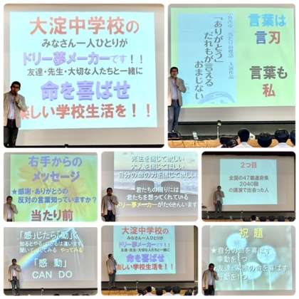 最後に生徒会長の吉井さんからお礼の言葉を述べさせていただきました。生徒の皆さんは2つ祝題(宿題)をいただきました。感想を書くだけでなく幸動(行動)しましょう。