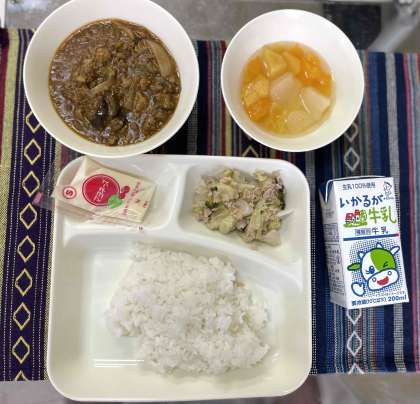 夏野菜のキーマカレーライス、ゴーヤとツナのマヨネーズ風味、ミックスフルーツ(缶)、牛乳です。