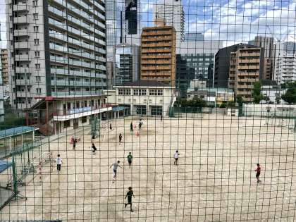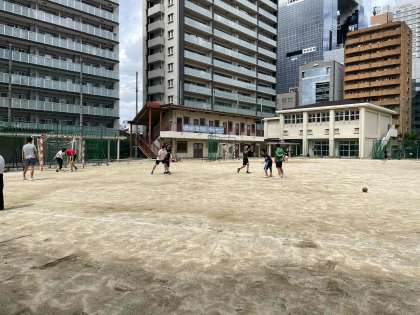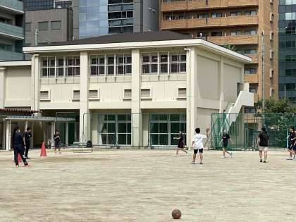 懇談中、グラウンドは前半と後半に分かれて練習をしています。