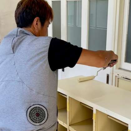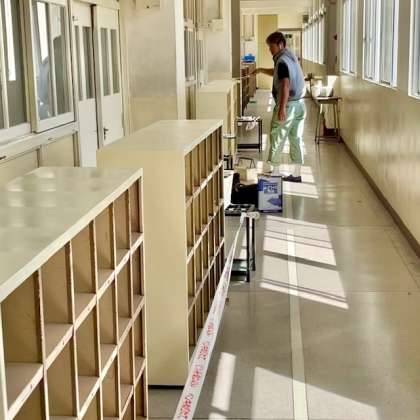 今日も気温が35度に迫る猛暑日です。猛暑の中、管理作業員さんが、1年生の教室廊下に設置している靴箱の塗装をしてくださっています。ありがとうございます。