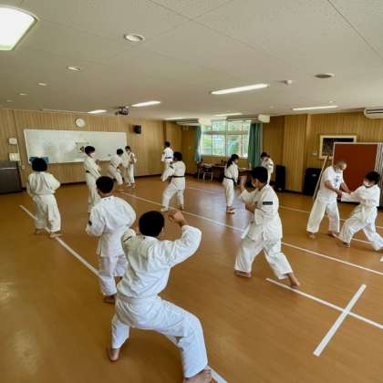 少林寺拳法部の練習です。全国大会に向けて気合い十分です。多目的室もエアコンで快適です。