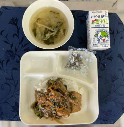 マーボー厚揚げ丼、中華スープ、ミニフィッシュ、牛乳です。