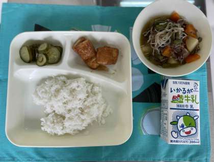 肉じゃが、厚あげのみそがけ、きゅうりのゆずあえ、ご飯、牛乳です。