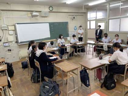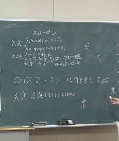 スローガンを、各校が発表して投票をして1つテーマを決めました。その後、他教室にいる学校と、通信にて共有をしました。その代表生徒を本校の生徒会長が全うしました!