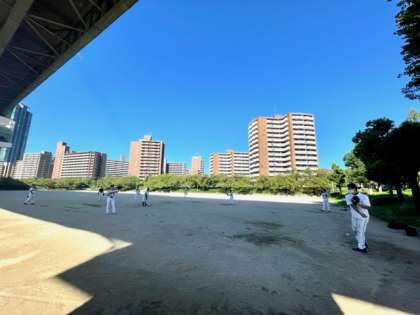 台風の影響で開催が心配されましたが、晴天に恵まれ、本日試合が予定通り行われます。8時30分に集合してウォームアップを行行なっています。
