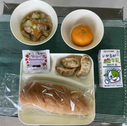 揚げ餃子、鶏肉ととうがんの中華煮、みかん(冷凍)、コッペパン、イチゴジャム、牛乳です。