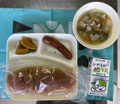 ウィンナーのケチャップソース、スープ、焼きカボチャ、さつまパン、牛乳です。