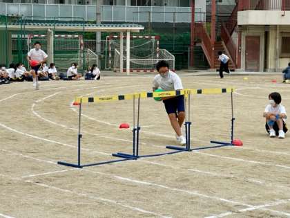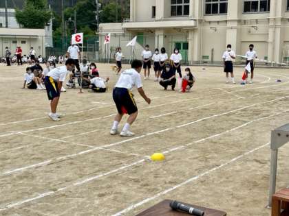 ボールは友だちの予行です。サポートルームから車椅子で予行に参加した生徒もがんばりました。その姿に応援席の生徒から大きな拍手がありました。