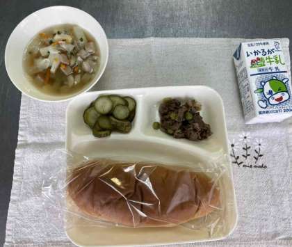牛肉のデミグラスソース、スープ、きゅうりのピクルス、黒糖パン、牛乳でした。