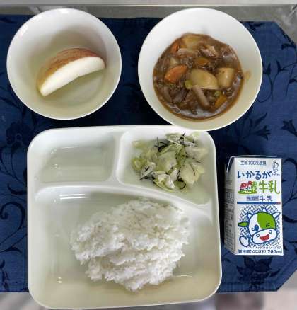 ハヤシライス、キャベツのひじきドレッシング、りんご、牛乳です。