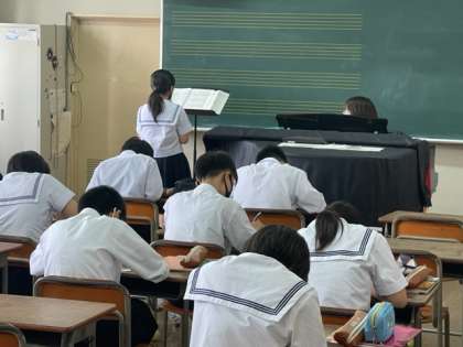 1年3組の音楽の授業です。今日はリコーダーの実技テストをしていました。とても上手に演奏できていました。