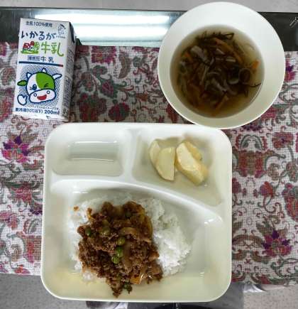 タコライス、もずくのスープ、焼きじゃが、牛乳です。