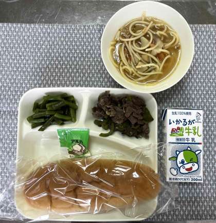 牛肉の香味焼き、ほたて貝とトマトのスープスパゲティ、さんとまめのサラダ、コッペパン、マーガリン、牛乳です。