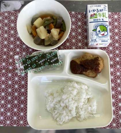 みそかつ、じゃがいもと野菜の煮物、焼きのり、ご飯、牛乳です。