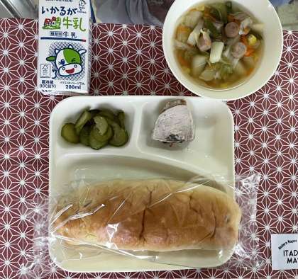 かつおのマリネ焼き、ウィンナーとじゃがいものスープ、きゅうりのサラダ、おさつパン、牛乳です。