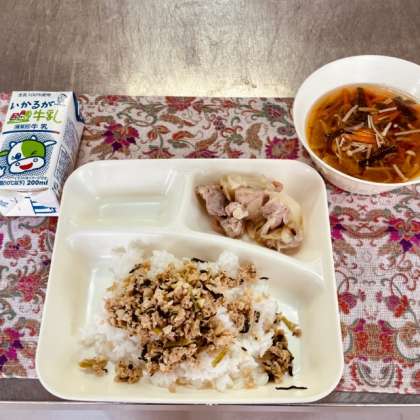 鶏肉の柚子塩焼、ソーキ汁、ツナ大豆そぼろ、米飯、牛乳です。
