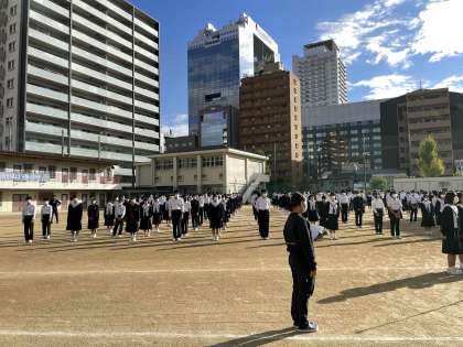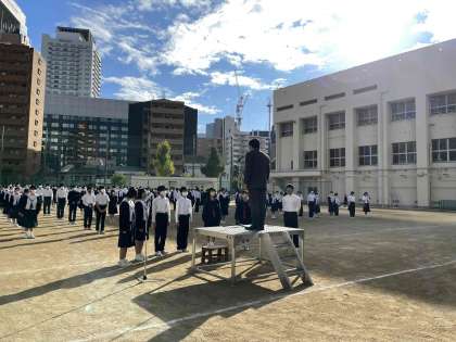 毎週月曜日は全校集会です。恒例の校長先生との挨拶です。