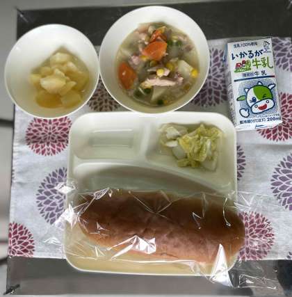 豆乳コーンクリームシチュー、ハクサイのピクルス、パインアップル(缶詰)、黒糖パン、牛乳です。