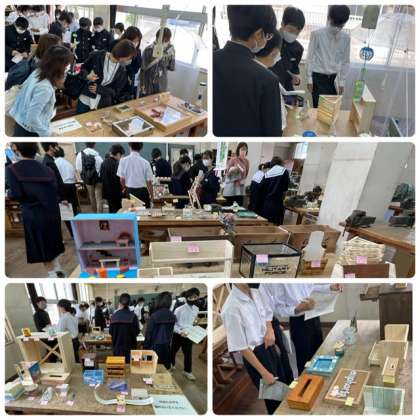 技術室では、技術科1年・2年の夏休みの課題が展示されていました。大阪市立中学校総合文化祭で全国大会出品が決まった作品をはじめ、創意工夫が凝らされた作品が見る人を魅了してくれました。