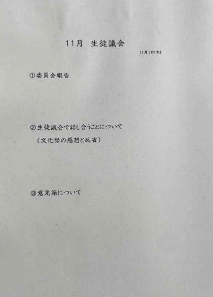 委員会報告、文化祭の感想と反省、意見箱と意見交換をおこないました。