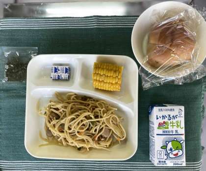 ウインナーときのこの和風スパゲティ、焼きとうもろこし、固形チーズ、黒糖パン(ハーフ)、牛乳です。