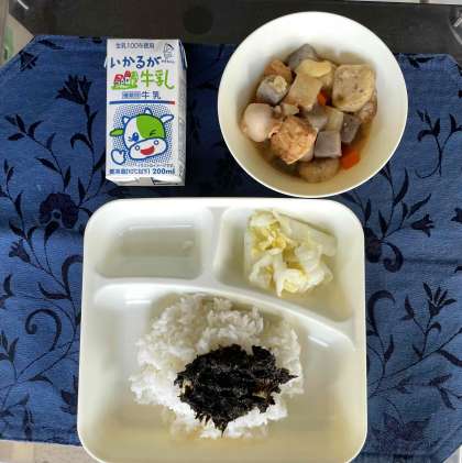 関東煮、はくさいの甘酢あえ、のりの佃煮、ご飯、牛乳です。