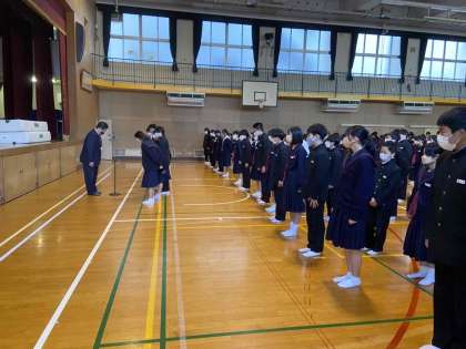 本日は体育館にておこなっています。校長先生と朝の挨拶です。