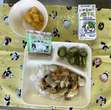 中華丼、きゅうりピリ辛あえ、ソフト黒豆、黄桃、牛乳です。