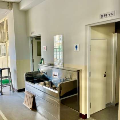 各フロアの北側トイレの改修工事も進んでいます。こちらも仮囲いが撤去され、廊下が広くなりました。あと少しで完成です。