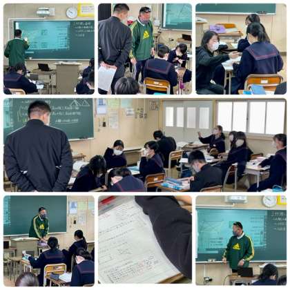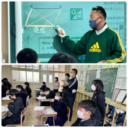 2時間目、2年3組で松田先生が研究授業を行いました。単元「平行線と面積」で「合同でない図形でも、面積が等しくなる」を学習の目当てに学習しました。授業の後半では生徒同士が学びを交換し、主体的で活発な学びが見られました。ベテラン教員の授業を、中堅、若手教員が学ぶ機会にもなりました。