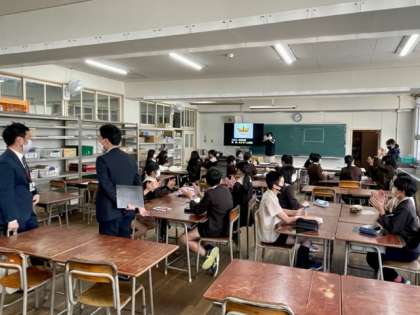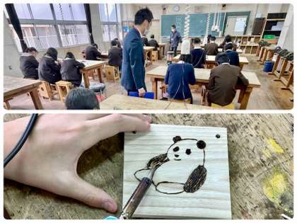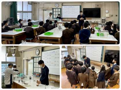 小学6年生の中学校授業体験(模擬授業)の様子です。写真上から美術、技術、理科です。理科では、小・中交流授業で毎週小学校理科の指導に行っている西澤先生も居られます。